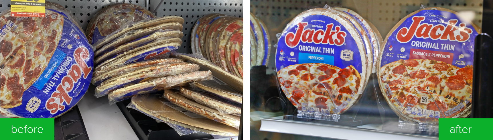 NEXT PRO PizzaRack™ keeps shelves orderly, functional, and attractive—making every restock a breeze. The locking, adjustable-width sidewalls keep planograms in check, ensuring that shelf space doesn’t shift during stocking or sellouts. With PizzaRack’s pusher paddle and anti-tip technology, every pizza package stays upright, eliminating messy stacks while supporting product integrity.