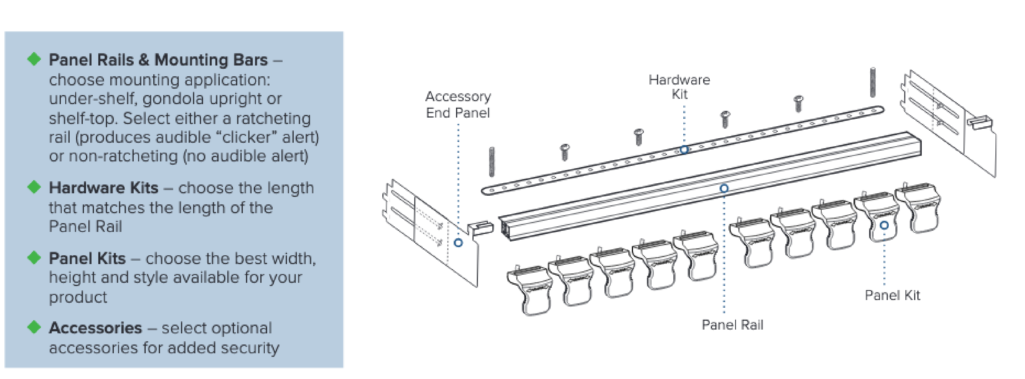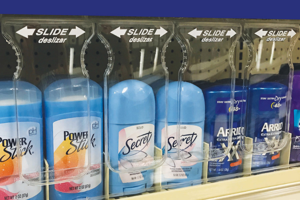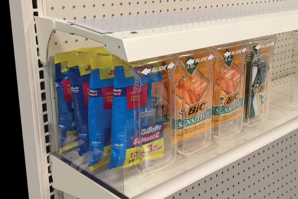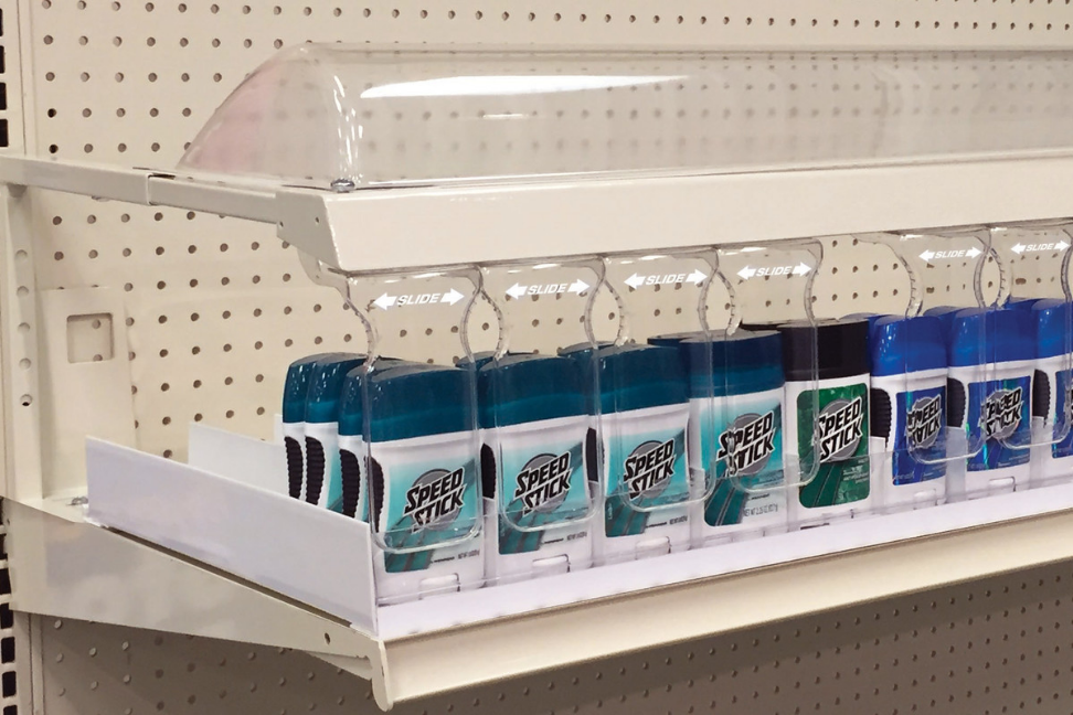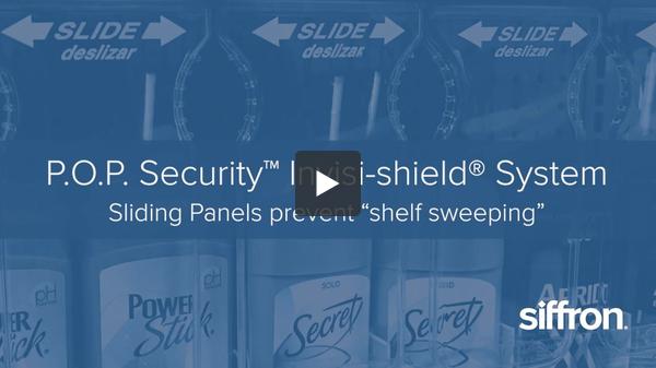 Invisi-Shield™ System secures high-value, high-loss product, while allowing customers access to product for purchase. The Invisi-Shield features various sizes of single-facing product shields that install below display shelves or into gondola shelf uprights. The product shields are crystal-clear "invisible" panels that ensure products are visible and appealing; contoured edges on panels provide comfortable access for shoppers. Individual panels slide left and right to expose single facings of shelved or pegged product, allowing customers to shop them. No locks. No alarms. P.O.P. Security™ Invisi-Shield™ System keeps pegged or shelf merchandise accessible to shoppers while still effectively preventing potentials offenders from product sweep.